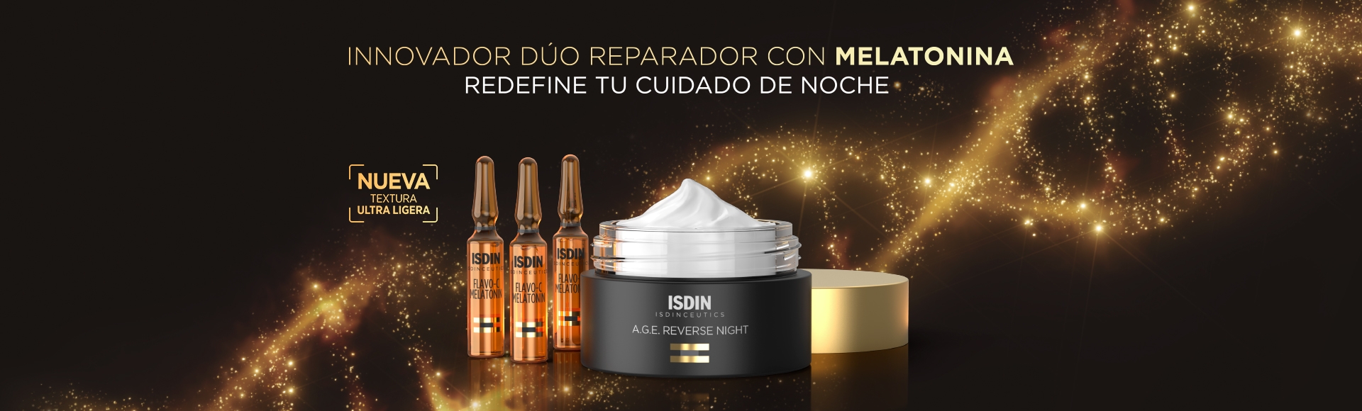 Combina tu Isdinceutics Flavo-C Melatonin con A.G.E. Reverse Night, la crema reparadora de noche con Melatonina, que estimula las defensas antioxidantes para combatir las agresiones recibidas durante el día. Aplícala después de la ampolla para lucir una piel perfecta.