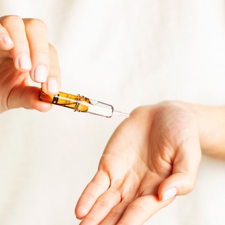 Aplica 1/3 de la ampolla en la mano y extiéndelo por los pómulos, frente, barbilla, cuello y escote