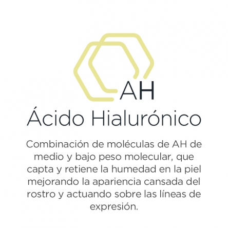 Combinación de dos moléculas de ácido hialurónico, que ayudan a la piel a recuperar sus niveles de hidratación para conseguir una piel radiante.